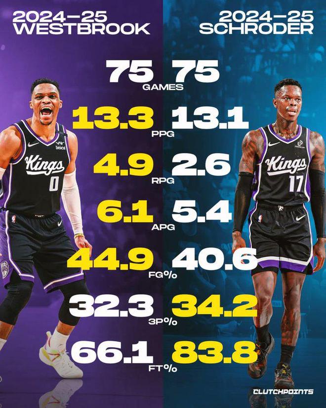 美媒ClutchPoints晒出了上赛季两人的数据对比:威少场均得到13.3分4.9篮板6.1助攻,投篮命中率44.9%,三分命中率32.3%;施罗德场均13.1分2.6篮板5.4助攻,投篮命中率40.6%,三分命中率34.2%;两人的各项数据都相差不大。