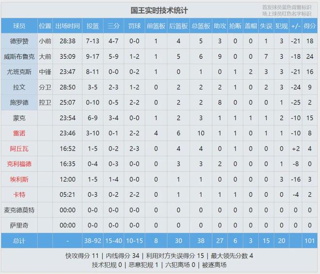 下半场雷霆对威少针对性防守,一突破就有2-3人包夹,切断他的传球路线,导致威少失误增多。威少本场正负值-18,已经是国王首发当中最高的。NBA杯除了决赛,其余也算常规赛战绩。雷霆9胜1负领跑联盟,国王3胜6负西部第12。